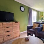 De woonkamer is knus en uitnodigend, met een fijne bank en comfortabele stoelen waar je heerlijk kunt ontspannen. Er is gratis wifi. Op de televisie kun je live tv kijken en programma’s terugkijken.